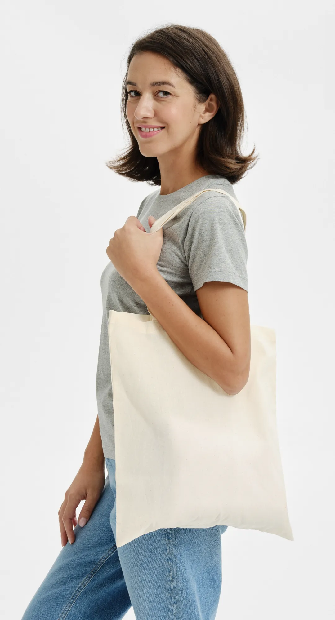 Praktická a skladná bavlnená nákupná taška s možnosťou nosenia v ruke aj cez rameno.