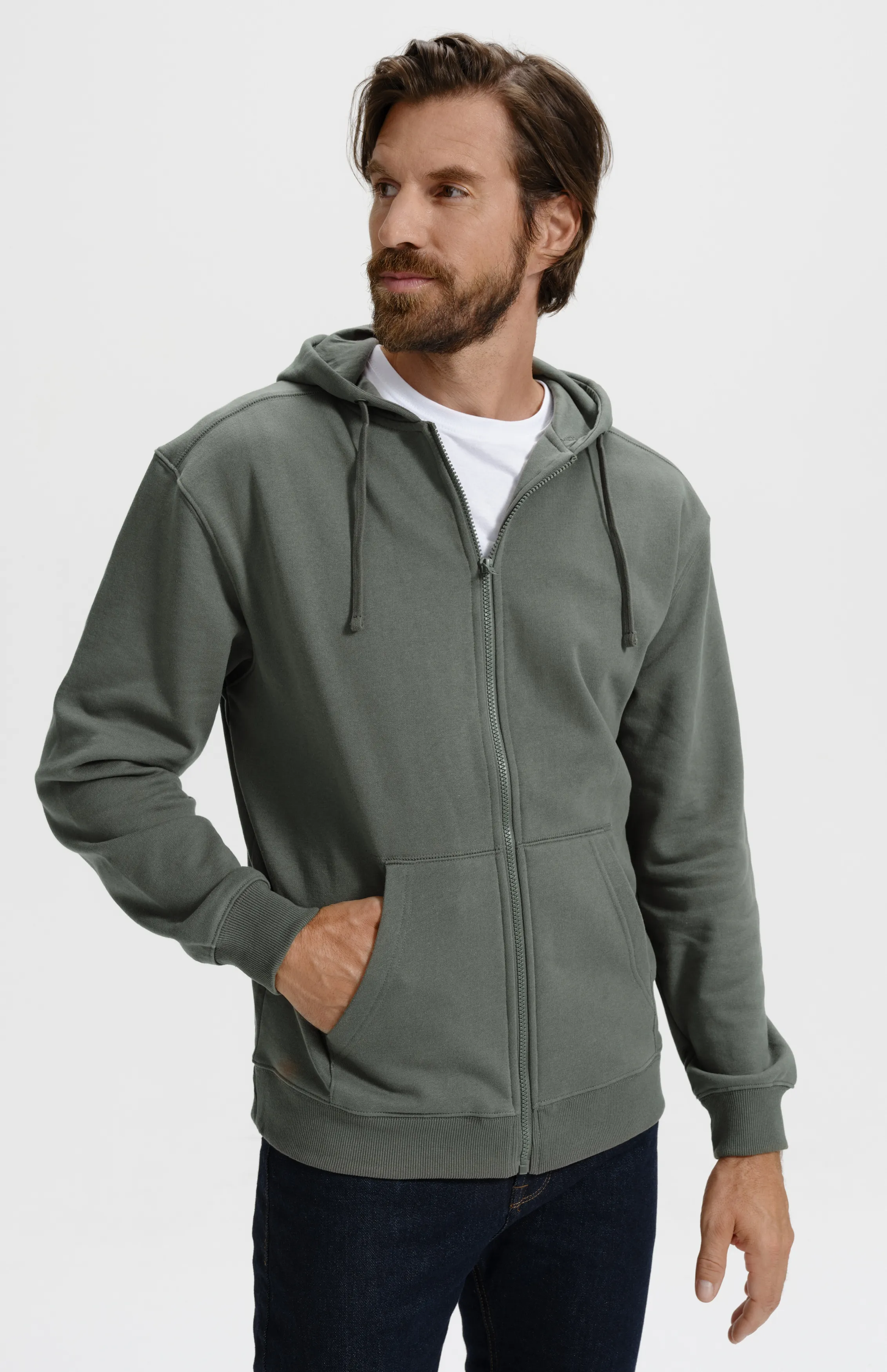 Pánska mikina s vreckami vpredu v štýle klokanky, s kapucňou a so zipsom.